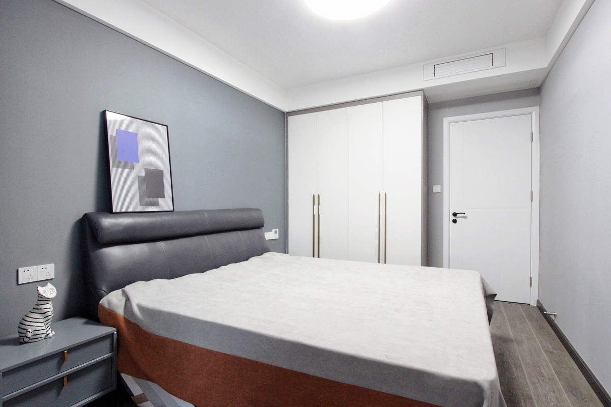 主卧整体色调以灰白为主,床头背景墙采用深色墙布,营造静谧感。
