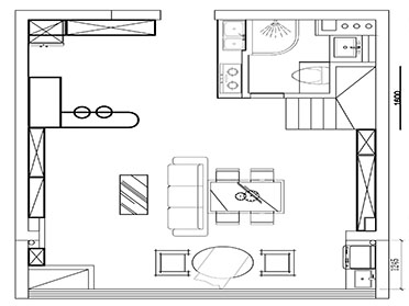 由玄关视角可以看出,入户的功能区为室内做出了很好的过渡。而由客厅往玄关的视角,一眼即可看尽所有,以吧台做分区处理,梯下空间做卫生间,每一处细节都得到了合理的利用。