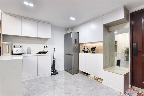 典型的公寓玄关,将空间合理规划,避免了空间浪费,留下足够宽敞的入户空间,让人眼前一亮。玄关鞋柜与吧台柜呈L形格局,使之为一个整体,双开门冰箱嵌入柜体,保留完整的功能性。