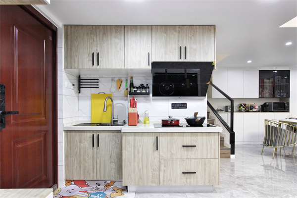 设计师利用公寓的格局特点,将厨房空间合理划分,入户之处,便能一眼揽尽整个屋子的功能分区。因为是女主人一人独居,厨房的功能格局,只需满足主人的日常的需求即可。