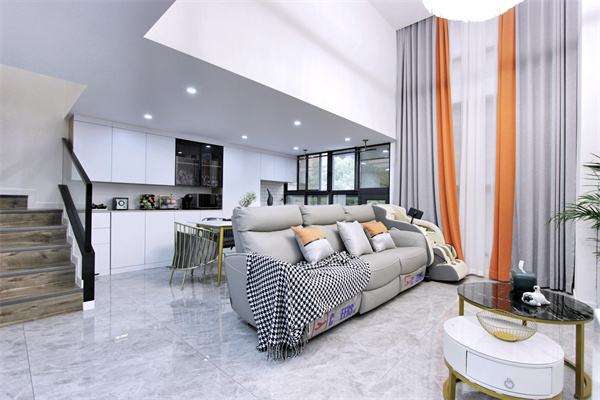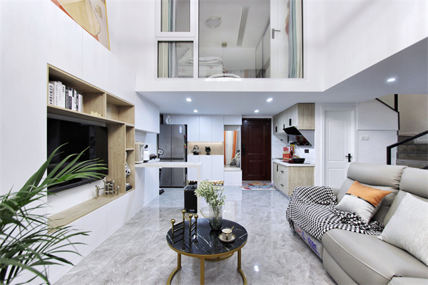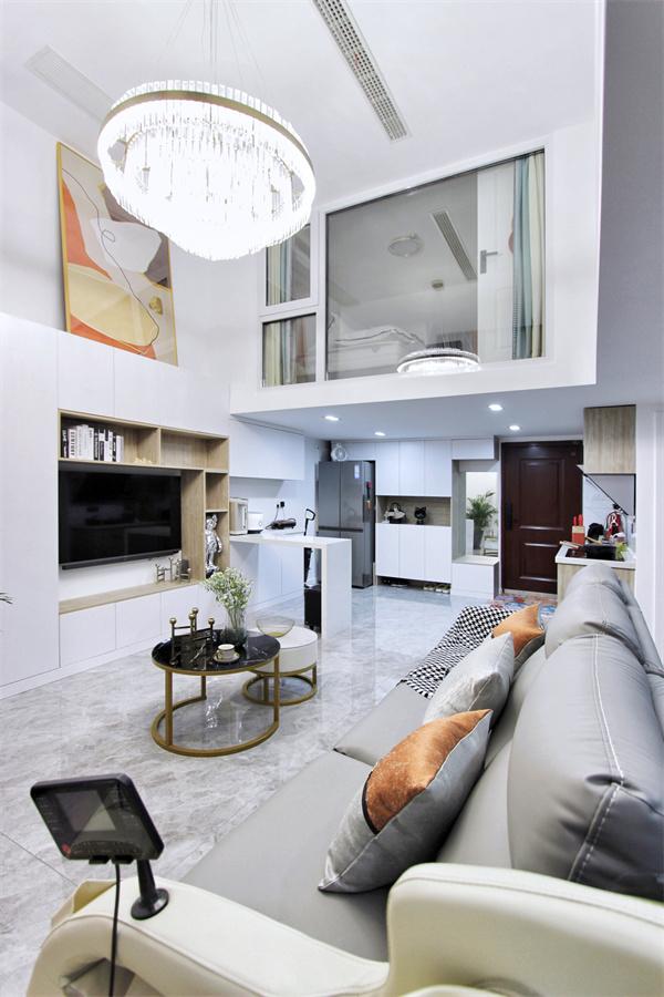 客厅空间的挑高处理,让整个空间更加开阔,二楼客卧为透明玻璃,很好的化解了客卧光线不足的缺点。