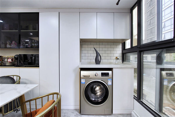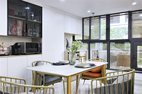 整面墙的餐边柜设计,兼具了收纳与展示功能,两扇柜门里,满满的摆放着着女孩子最喜欢的小零食。设计师将阳台与餐厅空间整合,餐边柜与阳台柜连为一体,合并功能区。