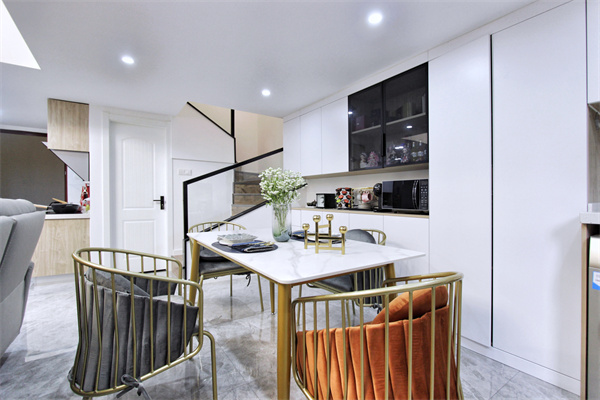 客餐厅为一体,沙发的摆放,以及吊顶的处理,使餐厅变成个一处独立的空间。餐厅因为层高的原因,设计师做了无主灯处理,利用分散性的筒灯,满足多重照明需求。