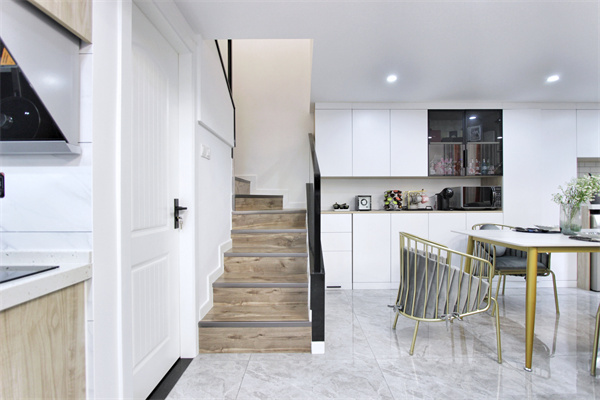 入户空间为引入室内做出隔断效果,楼梯也很好的被藏于后方。楼梯位于餐厅后方,梯下空间合理利用,成为一楼卫生间区域。盘旋而上的阶梯,以木料材质为主,宣示着这是通往静区的过渡区域。