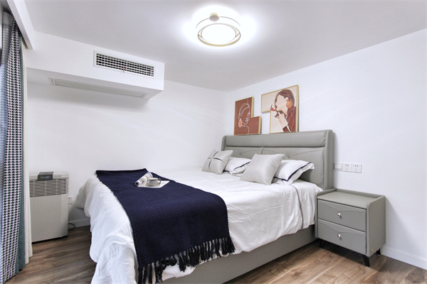 设计师将原为衣帽间的客卧区域改造为独立卧室,通体采用白墙形式,中性色调更适用于客人居住。透明落地窗户打造开放性的卧室空间,同时保证了空间的日常光照和空气流通性。
