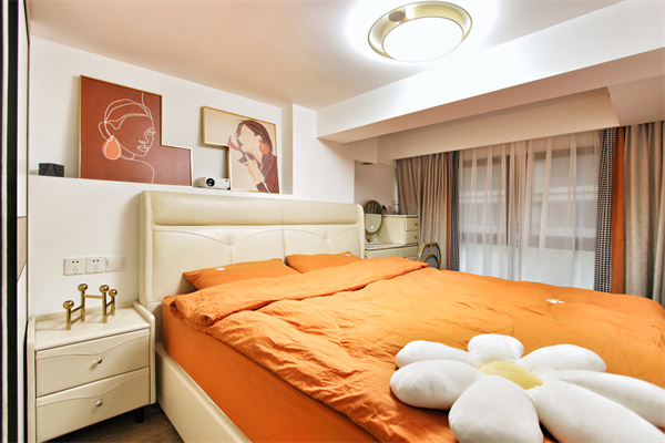 主卧空间整体为暖色调,女孩子更重视睡眠质量,而暖调空间会有助于安然入眠。对于女生而言,梳妆台亦是不可或缺的一部分,尺寸刚好的梳妆台,亦可以充当床头柜使用。