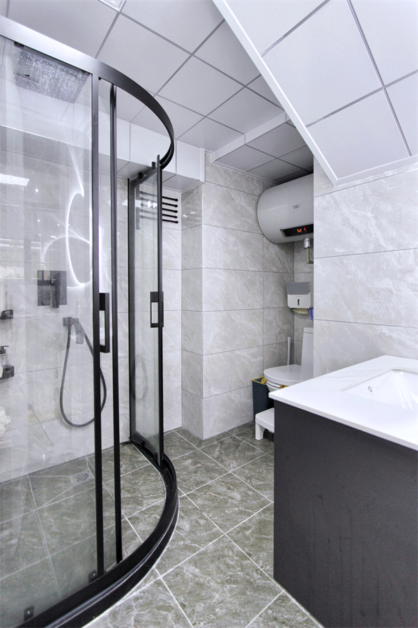 一楼客卫位于梯下,采用的是经典的黑白灰冷峻色调,除集成吊顶的主灯光外,浴室镜自带灯光使卫生间更加明亮。