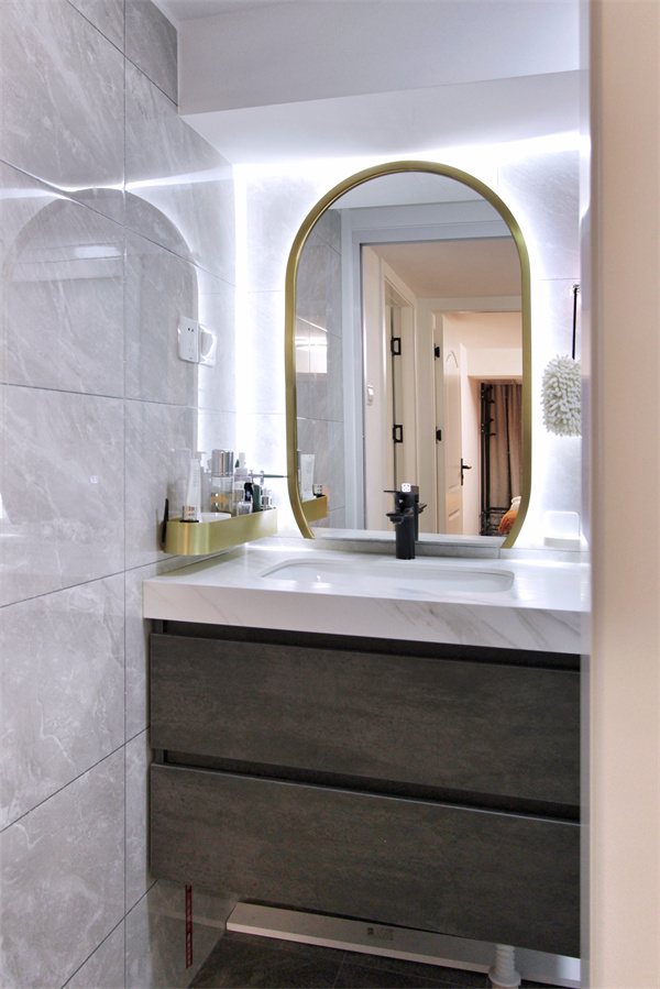 二楼主卫属于女主人独有,金属边框的镜子增加一点轻奢元素,隐形灯带更是点亮了整体空间。