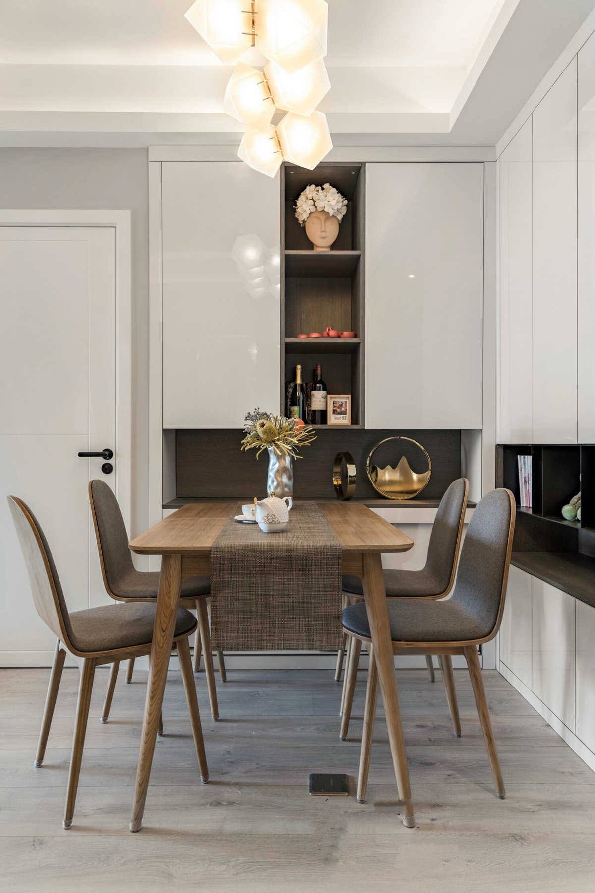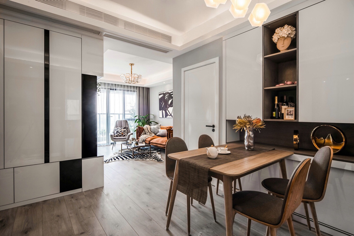 进门处即是餐厅,选用简单的餐桌,配上餐边柜,很好的解决了空间不足带来的问题。