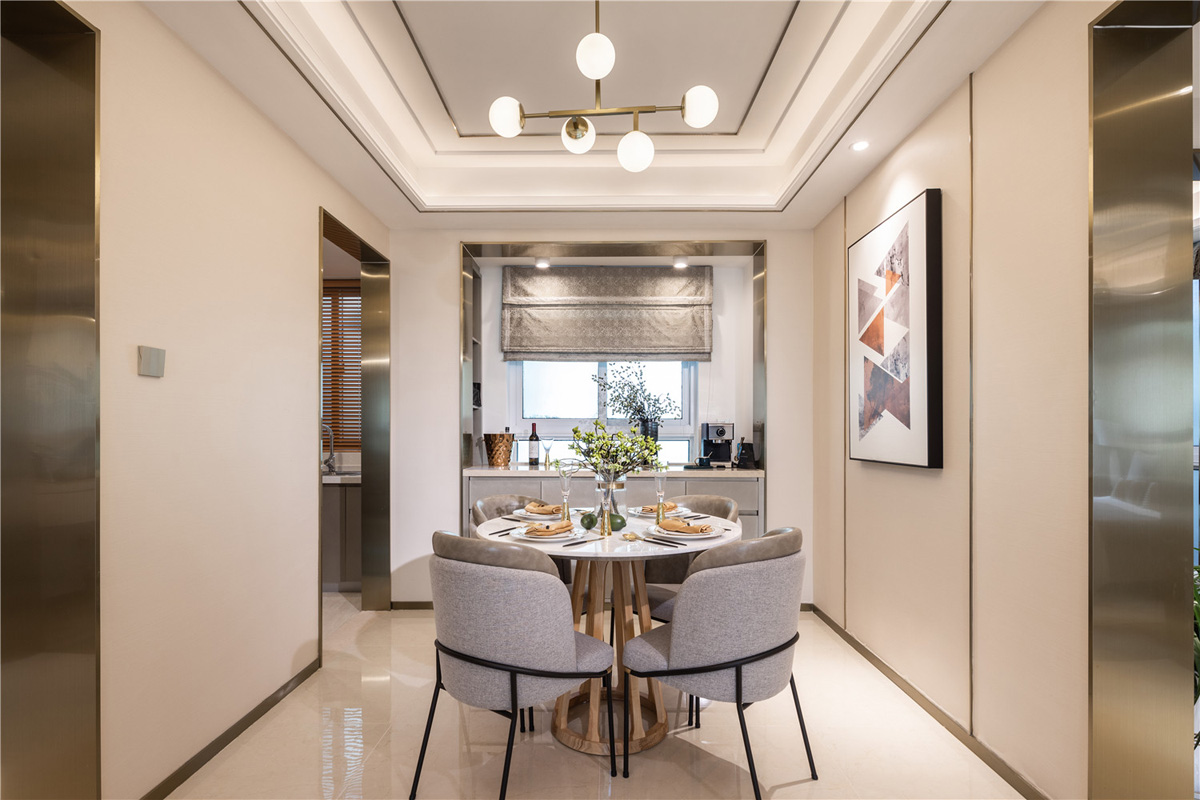 这个客厅光线充足,打进门就是阳光洒落,背景墙采用石材搭配金属线条手边,现代风格稍加轻奢元素,轻奢有度,有品质不奢靡。