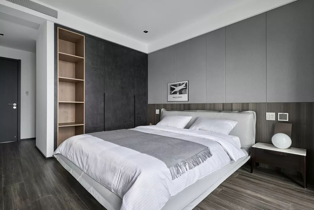 卧室灰色墙布做背景,用装饰画点缀,衣柜是深灰加原木色整个卧室的灰白搭配非常大气。