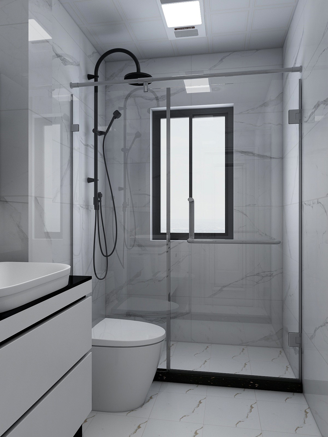 黑白色搭配的浴室,白色的浴室柜搭配白色的墙面,简洁明亮。