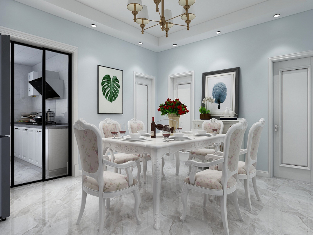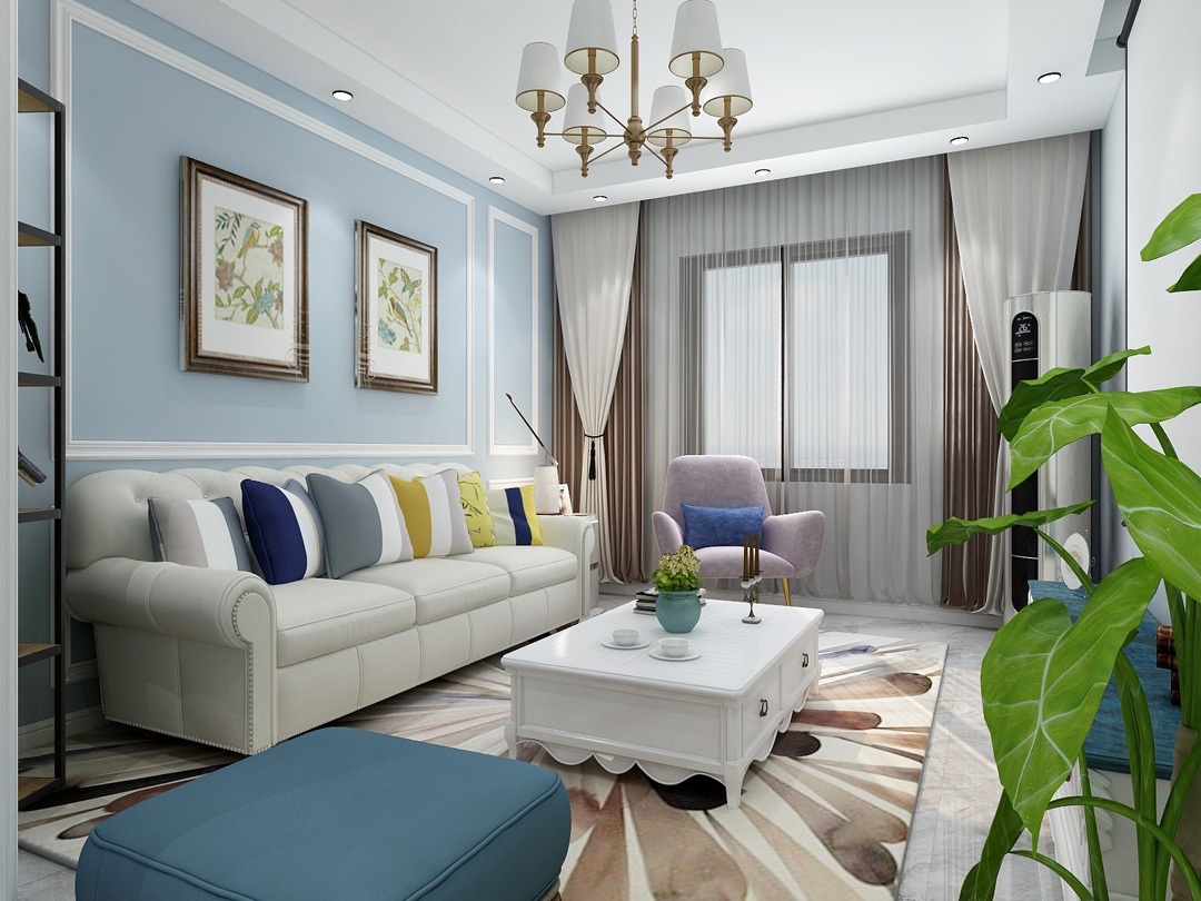 美式风格墙面整体刷的浅蓝色漆,再搭配上石膏线条,白色皮质沙发搭配灰色地砖,简洁大方。