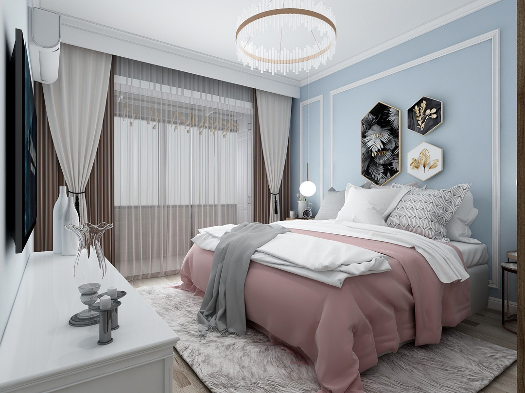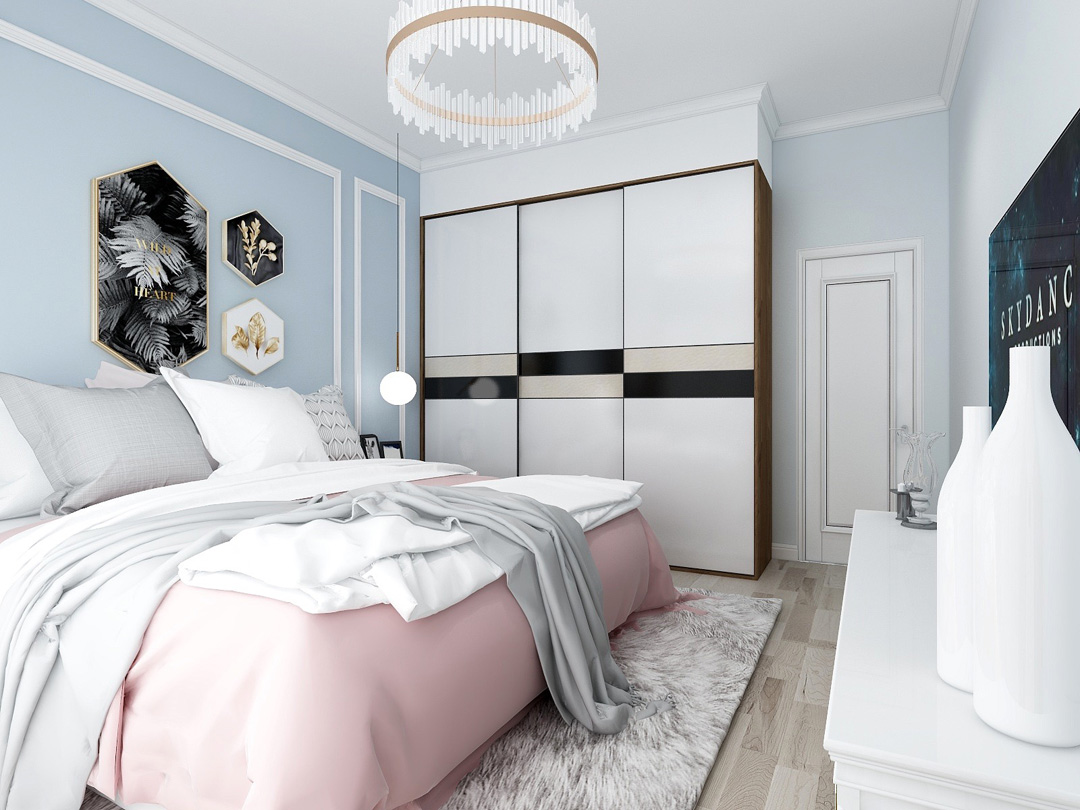 蓝色的墙面和粉色的床品,房间温馨舒适。