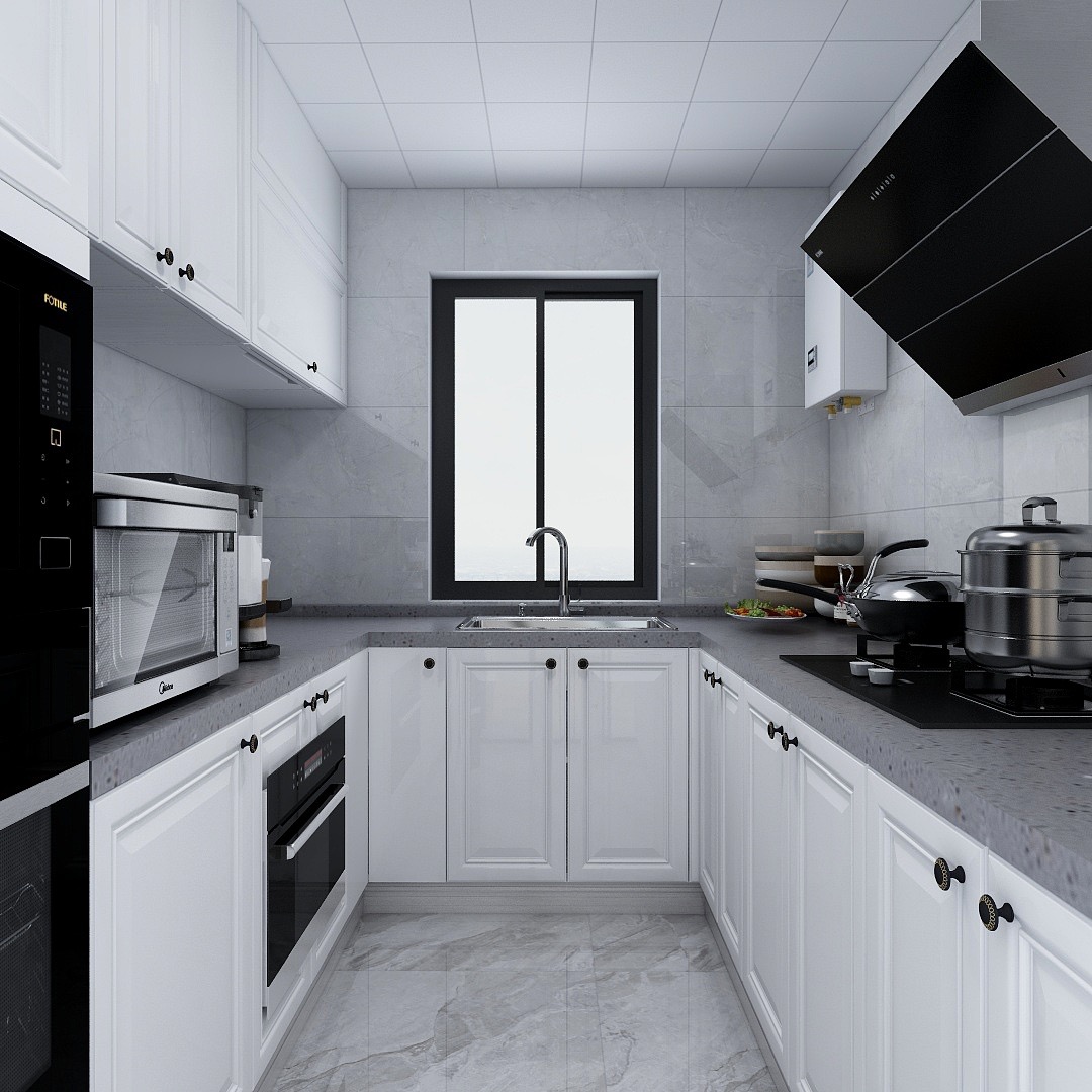 白色的模压门板搭配白色的墙地砖,U型的橱柜可用的操作空间也更大,整体明亮又大气。