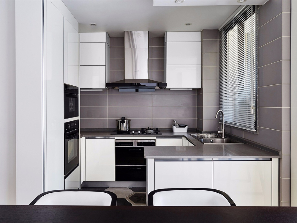 厨房橱柜采用白色柜体与灰色石材台面,简约时尚。