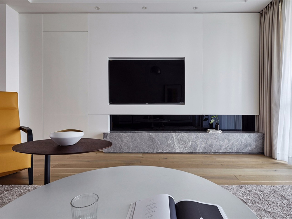 亮白的客厅中,点缀橙色,整个空间充满了个性、时尚、不羁。