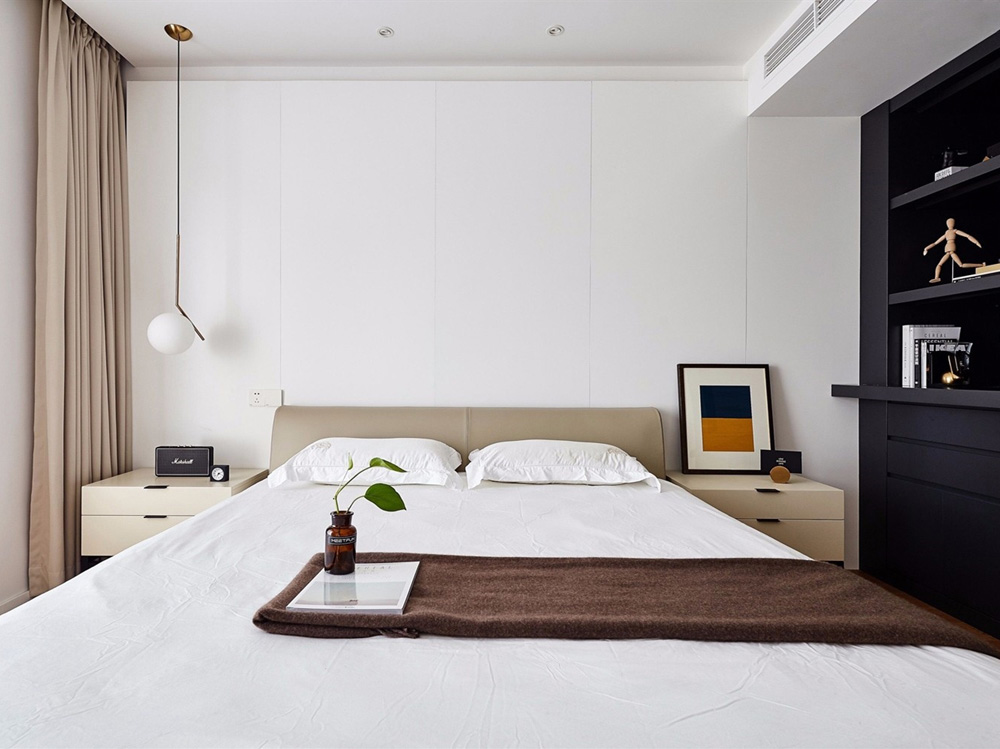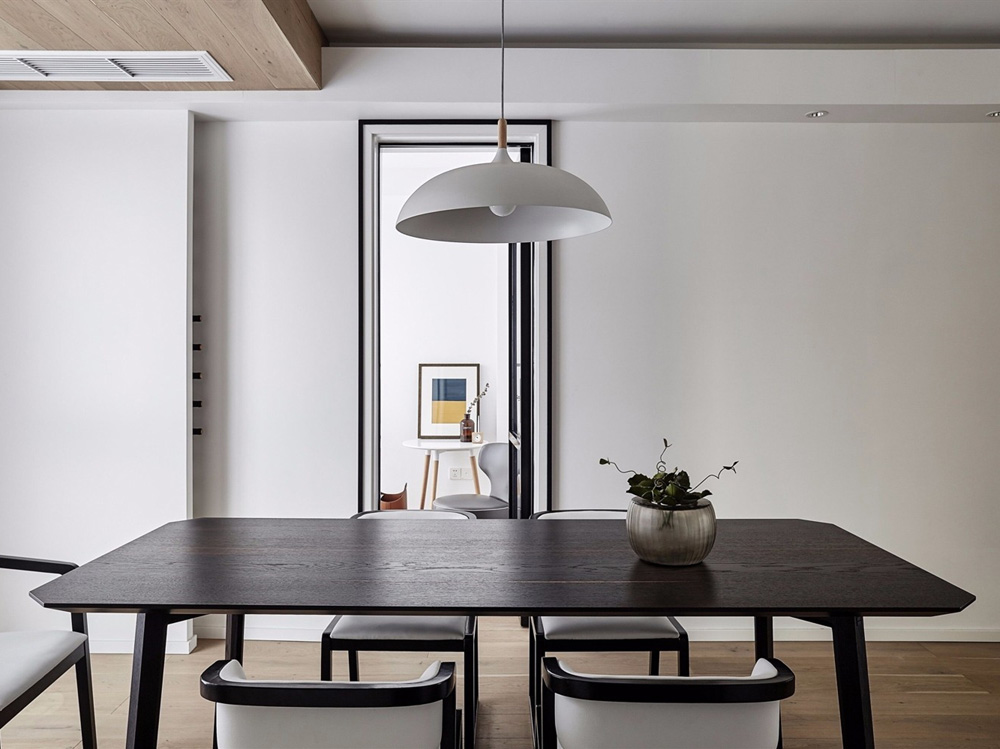 餐厅选择了深色餐桌搭配浅色餐椅,与整体的浅色形成对比,层次分明,而且更具品质感。