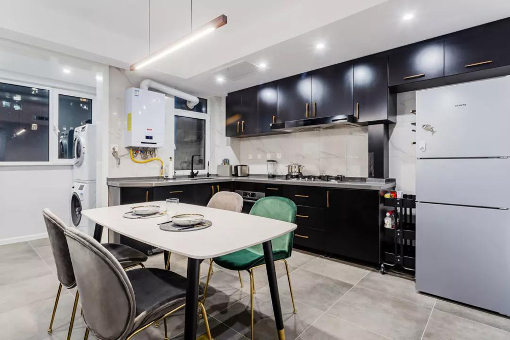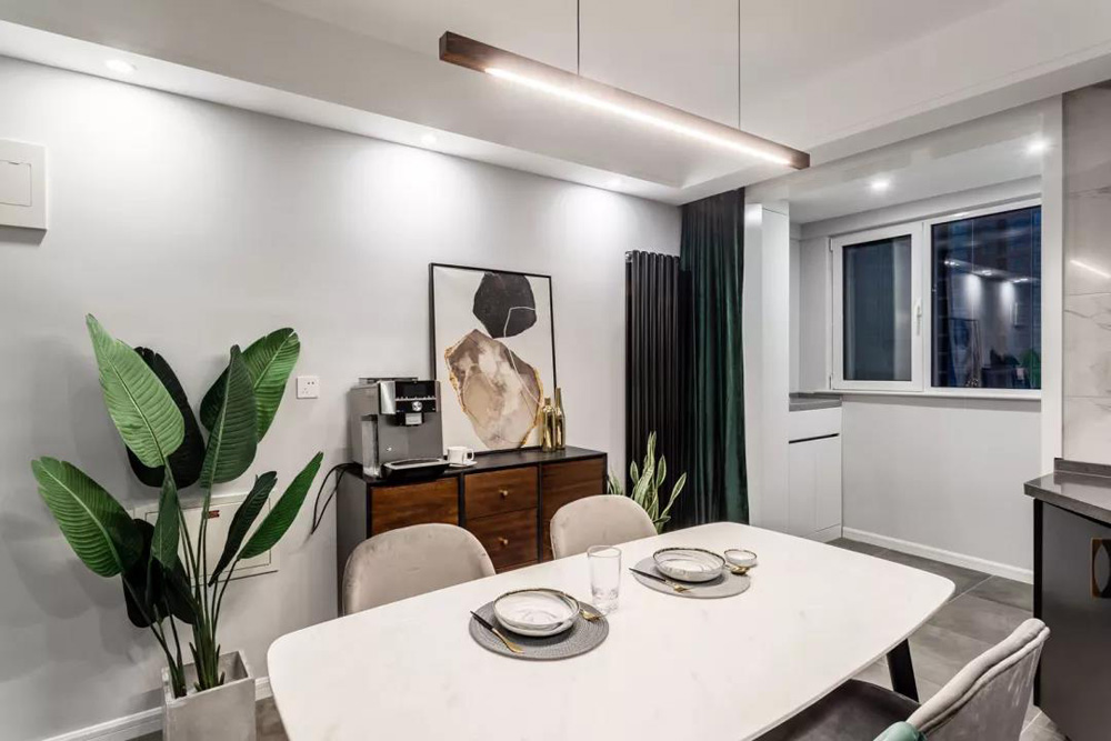 餐厅和厨房被融合在了一起,在橱柜和餐桌椅上都加入了大理石和金属元素,整个餐厨空间的配色也比较大气,看起来就让人感觉很有档次。