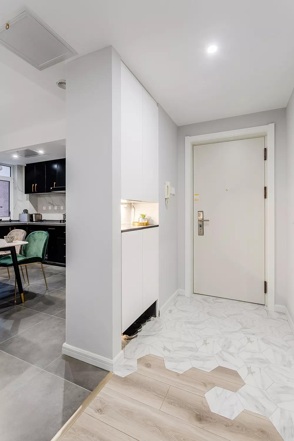 入户玄关处做了一个嵌入式的迷你鞋柜,还加上了藏光的设计。玄关的地面铺贴了大理石的六边砖,和木地板拼接起来让人感觉非常的好看。