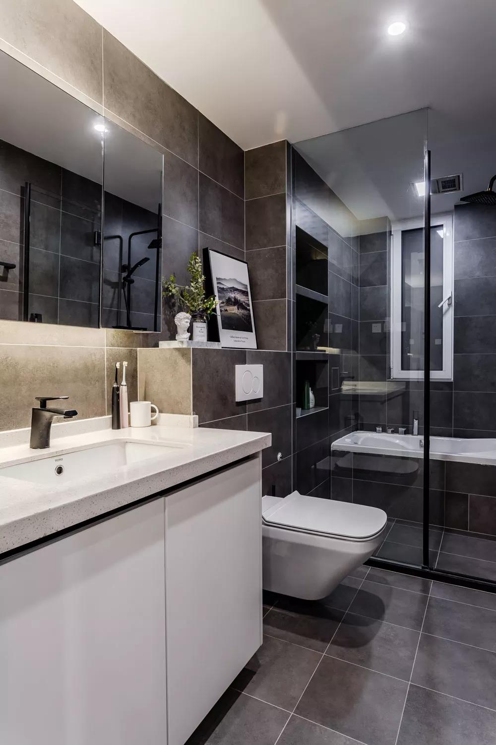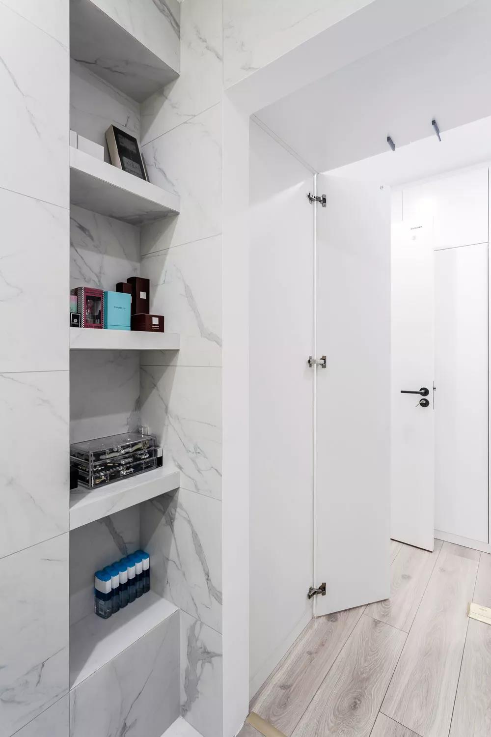 主卫与衣帽间相连,方便平时更换衣服,卫生间内用壁龛来增强收纳能力,白色大理石与浅色木地板搭配起来,也让人感觉非常的舒服。