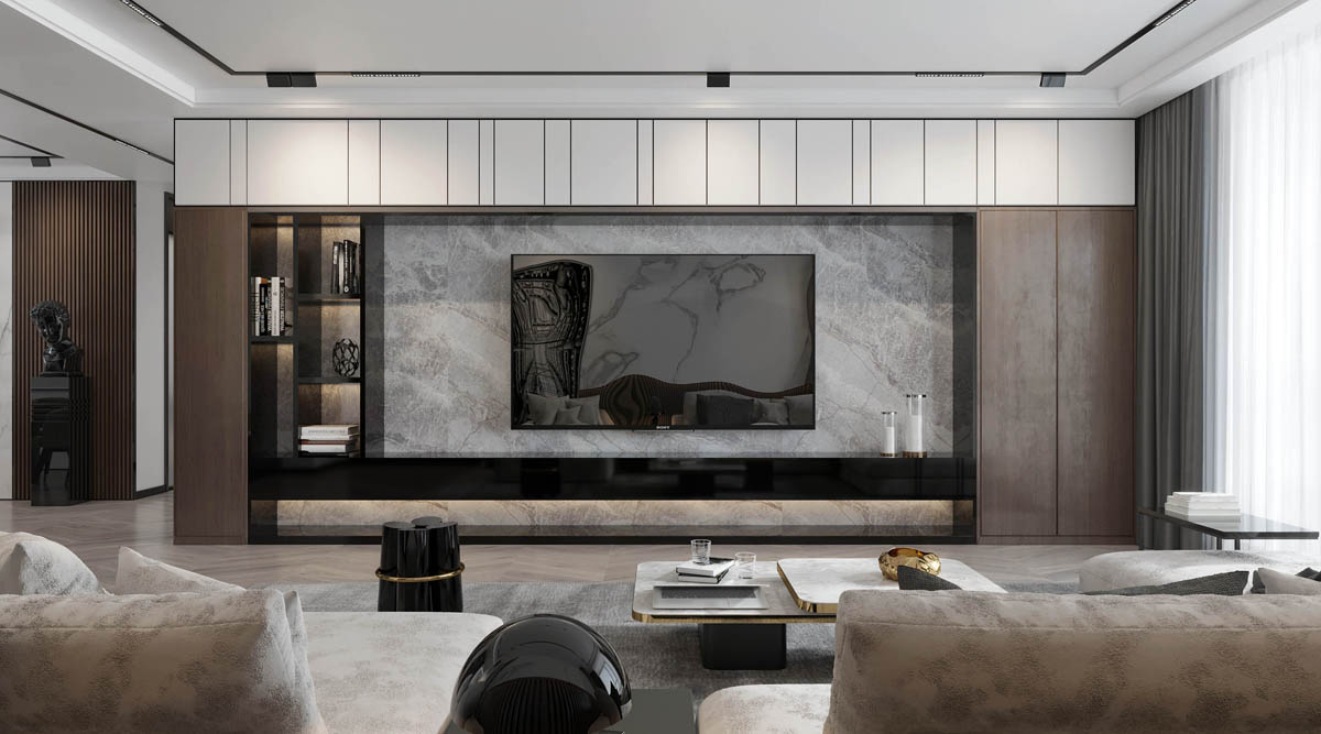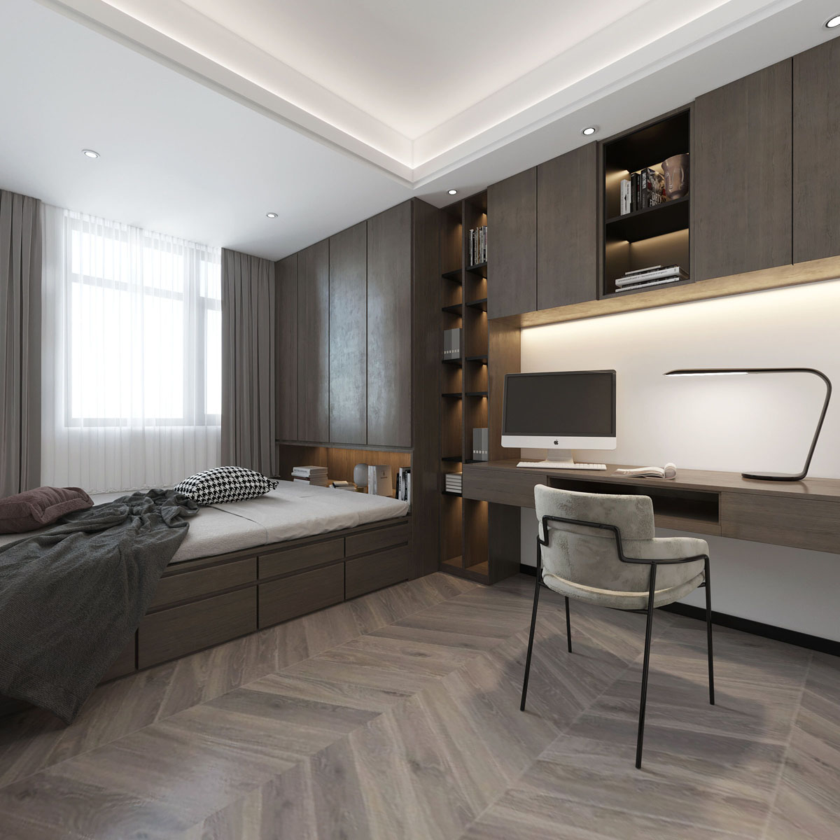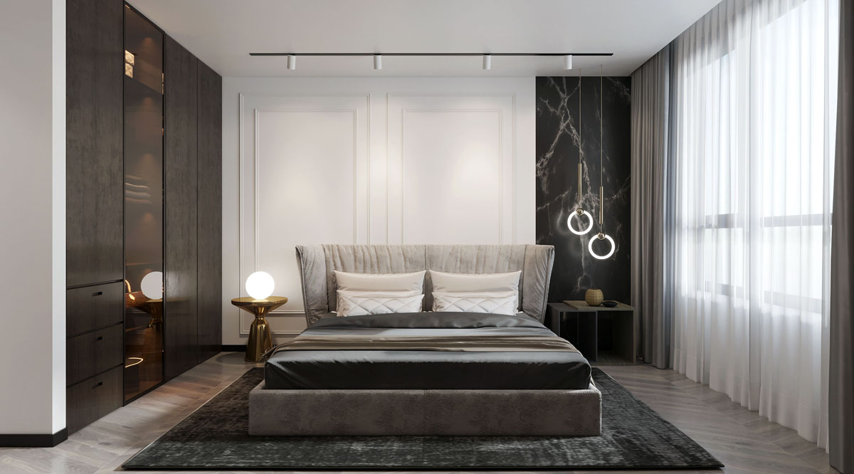 卧室延续了整体空间的色调,设计师运用沉静简美、简洁有力的设计语言创造出一个独具厚度的舒适空间。