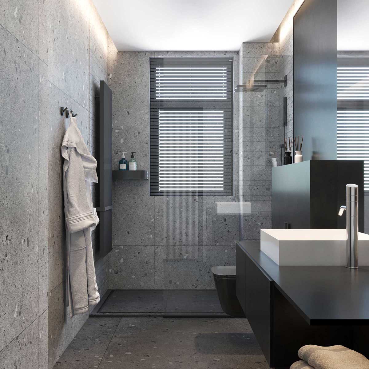 卫生间用水磨石铺设的地板和墙面,带有储物空间的简约洗漱台,可以放置毛巾、洗漱用品等等。